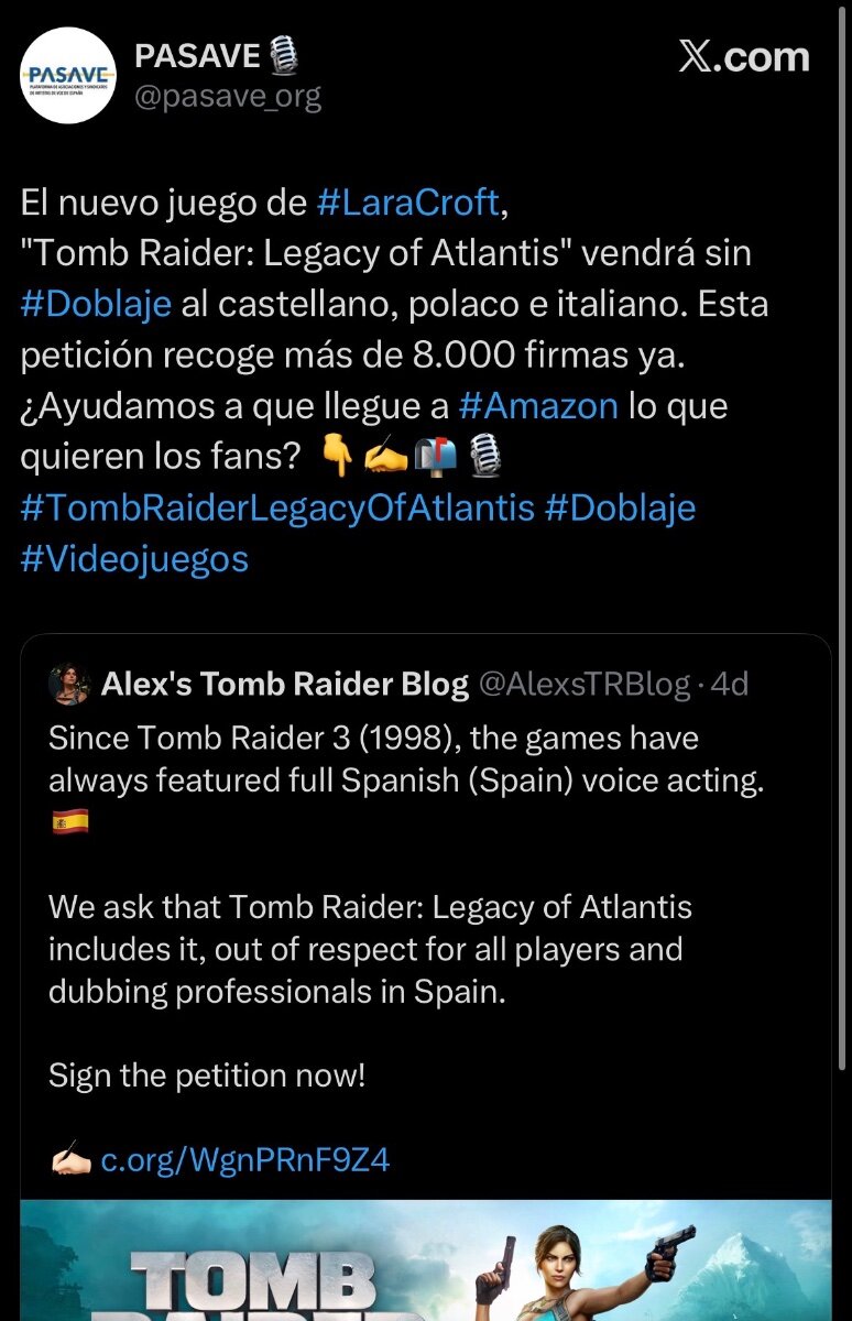 Sinceramente, esta noticia resulta bastante desalentadora. Ver que Tomb Raider: Legacy of Atlantis no incluirá doblaje en español de España —y que solo el español latinoamericano aparece con doblaje completo— se siente como un paso atrás enorme para muchos de nosotros. Durante décadas, Tomb Raider siempre ha salido con un doblaje español (de España) digno y reconocible, algo que se ha convertido en parte de la identidad de la saga para los jugadores de aquí. Pensar que Legacy of Atlantis podría ser el primer juego principal que no lo incluya es realmente triste y frustrante. Da la sensación de que se está dejando de lado a una comunidad que ha sido muy fiel y apasionada desde hace años. De verdad espero que sea simplemente un error en la lista de idiomas y no una decisión definitiva. Sería tremendamente decepcionante que una franquicia tan icónica dejara de apoyar a una parte de su base de fans que siempre ha estado ahí.